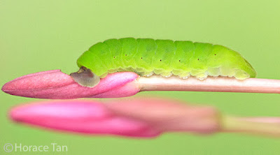 It takes about 3 days for the egg to hatch. The caterpillar nibbles away the polar portion of the egg shell to emerge, and does not eat the egg shell remnant. The newly hatched is pale yellowish with lateral orangy brown bands running lengthwise. Its body has a length of about 1.3mm and has long setae dorso-laterally and laterally. The prothoracic shield are both pale brown. Typically the newly hatched finds its way to adjacent flower buds, feeding on the peduncle or the bud proper where it will bore a hole to reach the flower parts within. After about 3 days of growth in the first instar, and reaching a length of about 2.5-2.7mm, the caterpillar moults to the next instar.