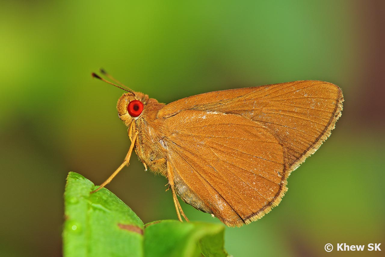 The Common Redeye's wings are a buff-brown above and unmarked. The underside is a more orangey-brown with the hindwing cilia prominently yellowish-white. The eyes of the butterfly are a deep red and stands out prominently. It is a fast-flying species, although more often spotted at rest with its wings folded upright in shaded undergrowth.